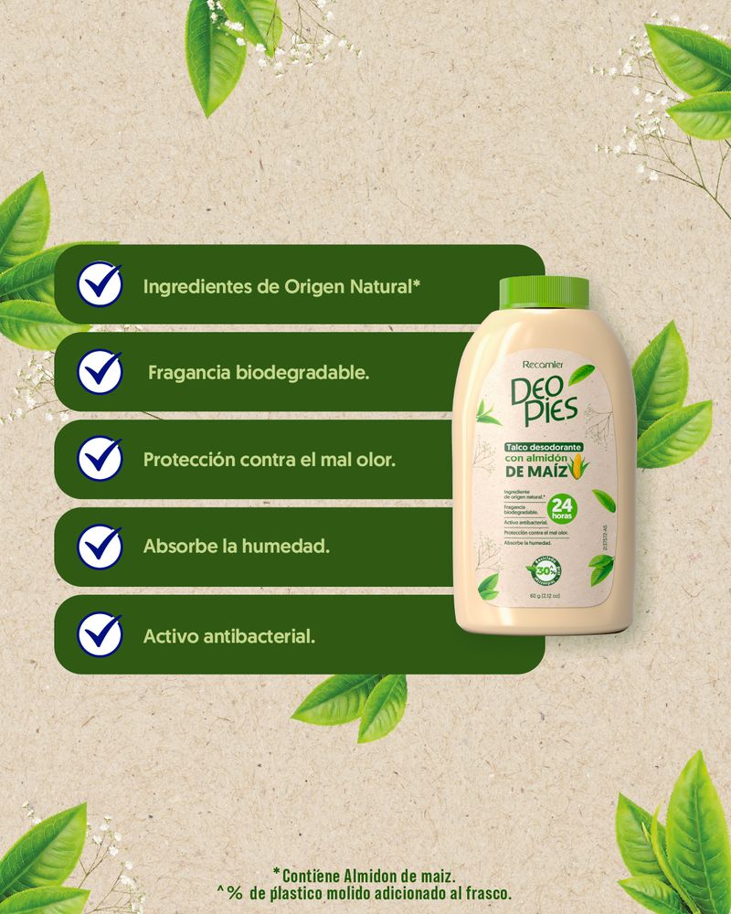 Mantén tus pies frescos y protegidos todo el día! 🌱 Su fórmula antibacterial con almidón de maíz absorbe la humedad y protege contra el mal olor hasta por 24 horas. Disfruta de una suave fragancia biodegradable y el frescor del mentol. ¡Dile adiós al mal olor y siente la frescura que dura! * Contiene Almidón de maíz.