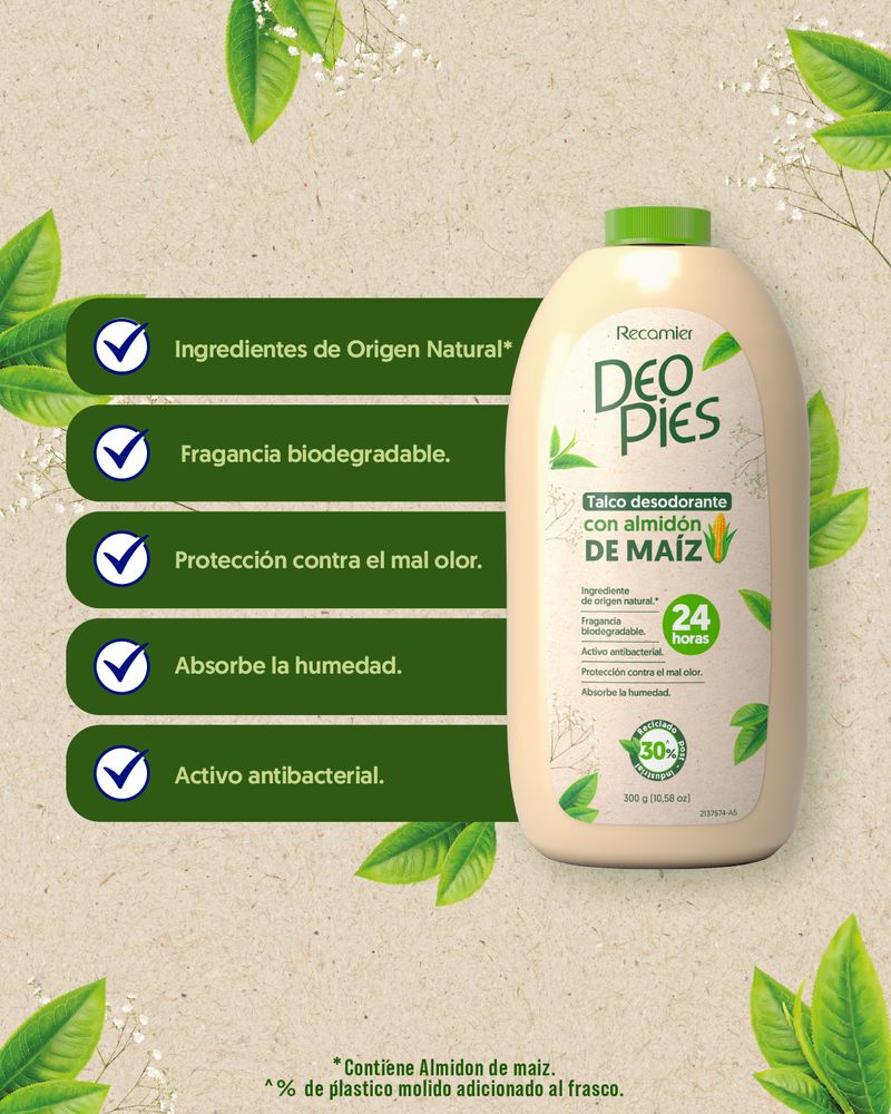 Mantén tus pies frescos y protegidos todo el día! 🌱 Su fórmula antibacterial con almidón de maíz absorbe la humedad y protege contra el mal olor hasta por 24 horas. Disfruta de una suave fragancia biodegradable y el frescor del mentol. ¡Dile adiós al mal olor y siente la frescura que dura! * Contiene Almidón de maíz.