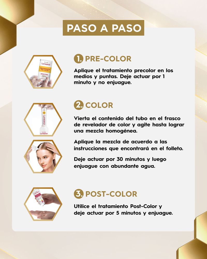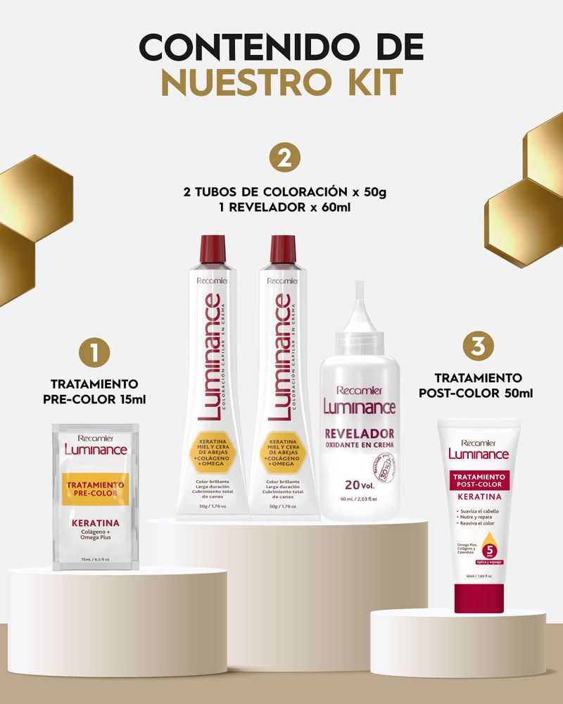 Keratina y Colágeno : La Keratina es la principal proteína del cabello reconocida por su acción reconstructora, aporta nutrición y fuerza a la fibra capilar, permitiendo que el cabello tinturado luzca más sano y radiante La El Colageno es una proteína que posee gran afinidad con la Keratina y contribuye a nutrir el cabello devolviéndole su vitalidad.